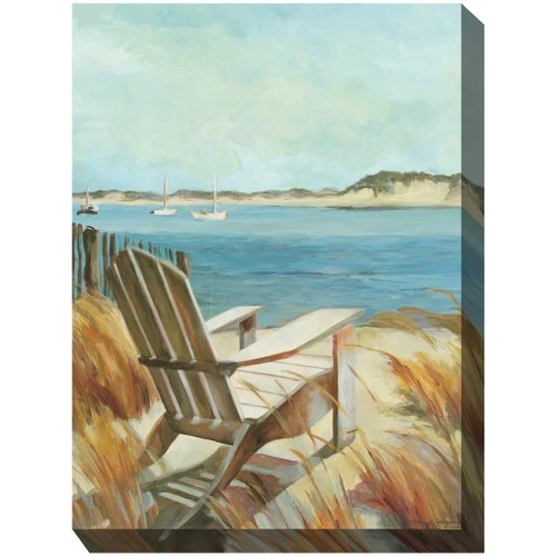 With an Adirondack chair on the beach and a sailboat filled sea, the Avalon Breeze Indoor/Outdoor Canvas Art completes your oceanside home.