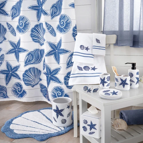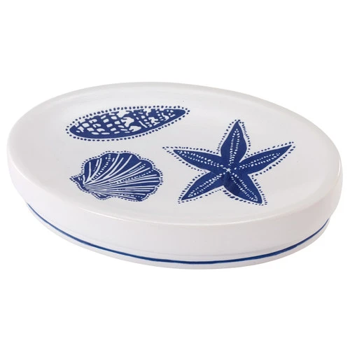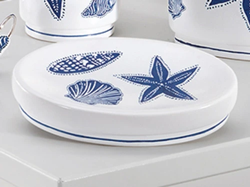 A Bella Coastal Decor Exclusive – White ceramic soap dish featuring deep blue seashells. 5 4/5″W x 3 7/10″D x 1 1/10″H