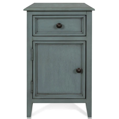 Accent your bedroom with the Bangor Seafoam Side Table with Cabinet. This side table features one door and one drawer in an aged seafoam finish for a coastal addition to your home.