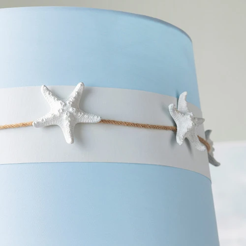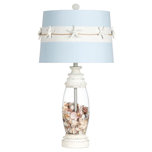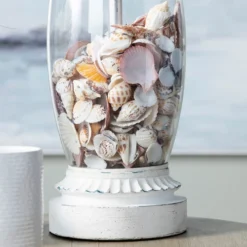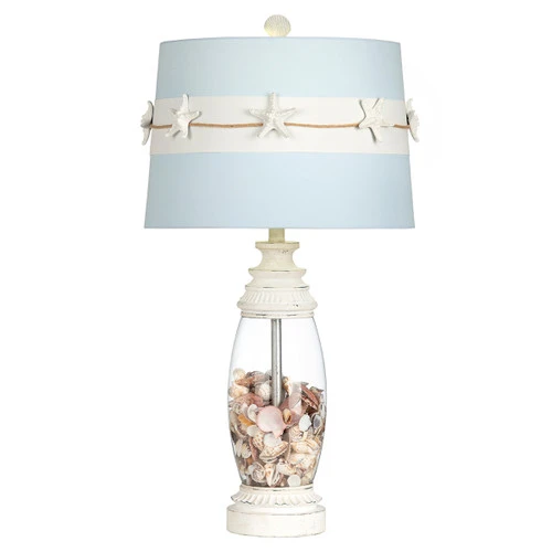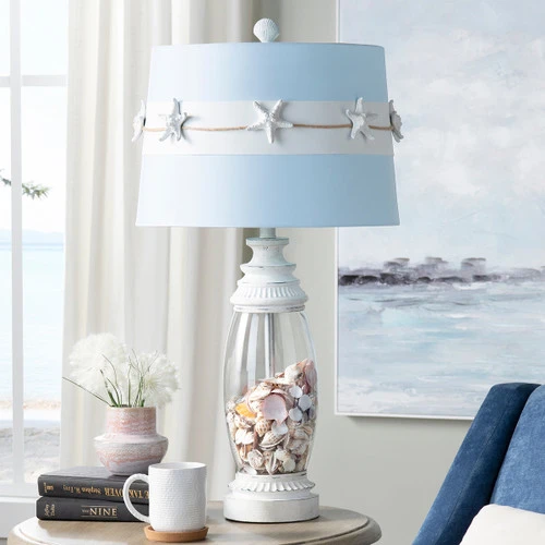 Give your living room a new coastal look with the Beach Memories Table Lamps – Set of 2. This table lamp set features a soft blue and white linen shade with hand-threaded strands of rope fiber and resin starfish accents rests atop a whitewashed base holding a clear glass reservoir filled with a variety of colorful seashells.