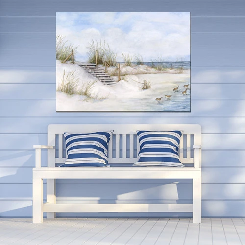Bring coastal style to your patio or garden with the Beachfront Outdoor Canvas Art. This outdoor wall decor has a beach scene depicting a set of wooden steps leading down to the water.