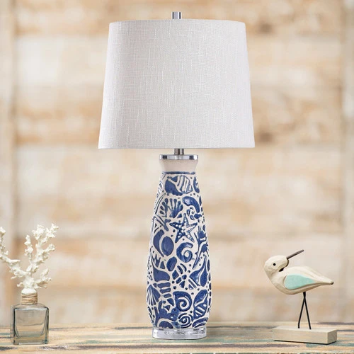 A Bella Coastal Decor Exclusive – Give your living room a seaside update with the Blue Beach Table Lamp. Crafted with a blue shell motif atop a clear acrylic base, this beach table lamp makes a beautiful accent. Wipe clean with a dry cloth.