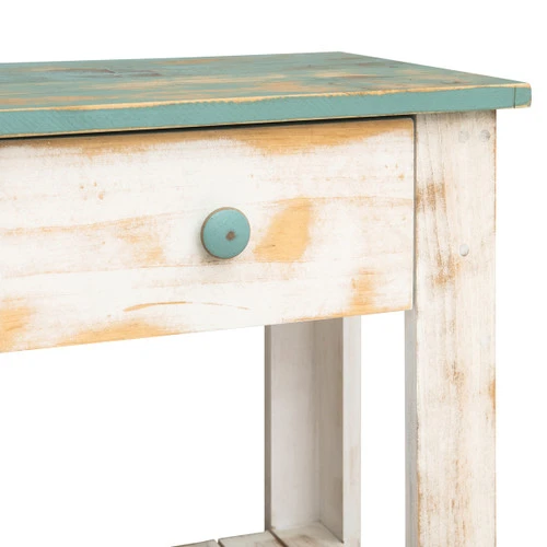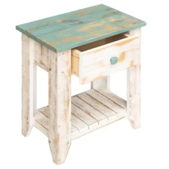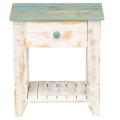 A Bella Coastal Decor Exclusive – Solid knotty pine end table in distressed hues of coastal blue and white with a slatted wood base. Each piece is unique; knots and slight imperfections will occur due to the nature of the wood. Made in the USA. 20″W x 13″D x 22 1/2″H.