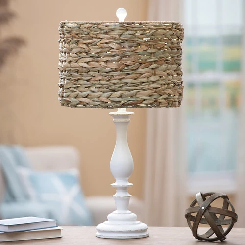 A Bella Coastal Decor Exclusive – Decorative resin lamp with a weathered finish and woven water hyacinth shade. Uses one 150-watt max bulb. 26 1/2″H.