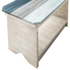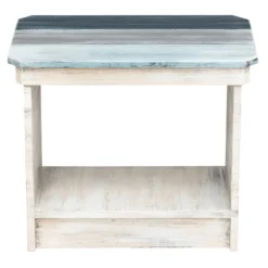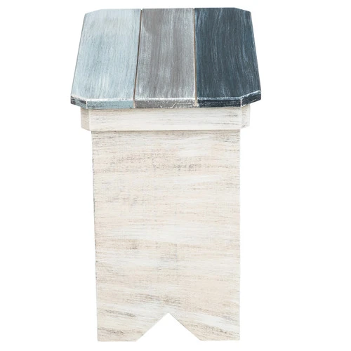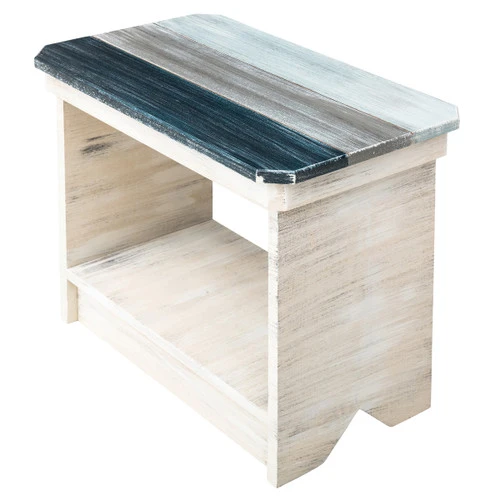 A Bella Coastal Decor Exclusive – Pine and manufactured wood table with slatted wood top in weathered hues of blue and white. Made in the USA. 24″W x 14 1/2″D x 21″H.