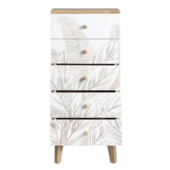 The Coastal Shore Five Drawer Chest is a versatile display and storage solution that combines the timeless elegance of white with the organic beauty of natural wood and seaside greenery, offering both functionality and style to any space.