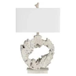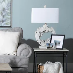 A Bella Coastal Decor Exclusive – Coastal lamp made of resin cast directly from driftwood and featuring a white linen shade. Uses one 150-watt max bulb. 18″W x 11″D x 29 1/2″H.