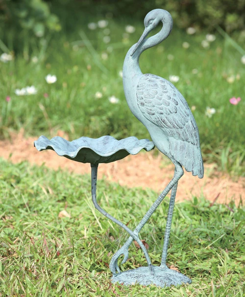 Showcase your beach style with the Elegant Crane Birdbath, designed with a stately crane by a flower shaped basin in a blue-green patina finish.