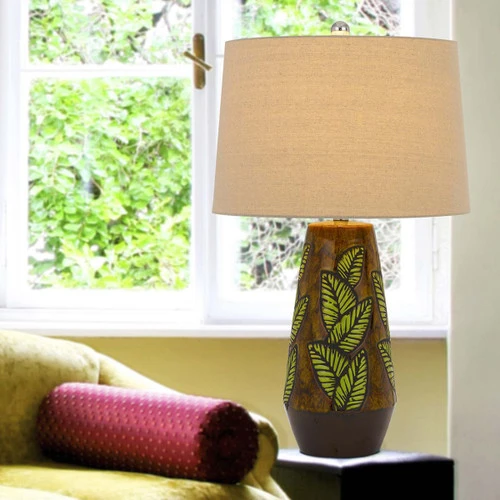 The Etched Green Leaf Table Lamp in cocoa is a stylish and functional addition to any tropical home, providing a warm light. Its ceramic construction gives it durability and a sleek aesthetic that complements any decor.