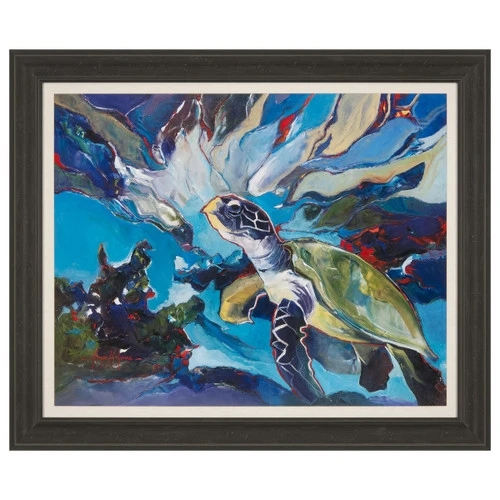 The Heading Home Framed Print adds a touch of seaside style to your home with a cute sea turtle swimming in a colorful scene.