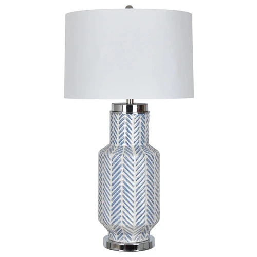The Indigo Coast Table Lamp brings seaside style to your den with blue broken chevrons on a white ceramic base with chrome accents.