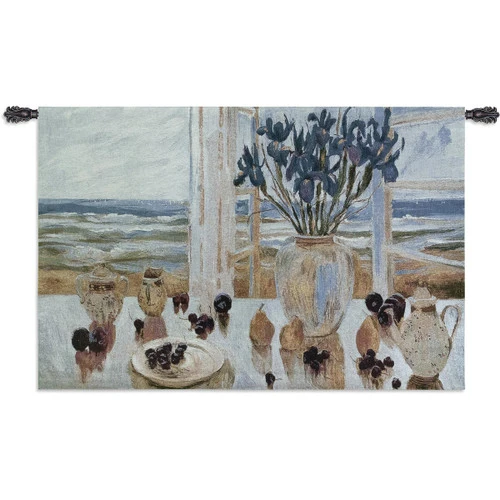The Late Afternoon Irises Wall Tapestry brings seaside style to your study with a beautiful still life of irises and fruit on a table overlooking the beach. Hanging rod not included.