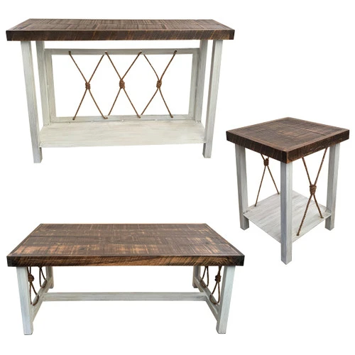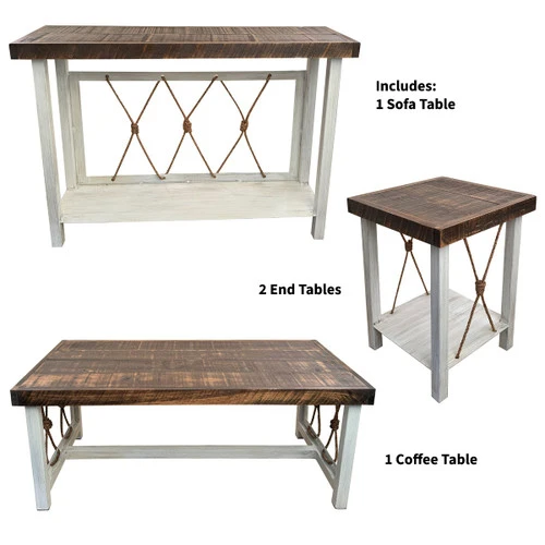 Create a nautical atmosphere in your den with the Mariner’s Table Set with Square End Tables & Wood Top (4pcs). This table set features a rough sawn wood top on a sturdy iron base with a weathered ecru finish and knotted rope accents for defining style.