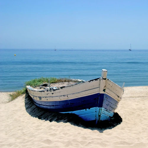 The Marooned Indoor/Outdoor Canvas Art adds a touch of coastal style to your home with an abandoned blue and white striped boat overflowing with sand and grass.
