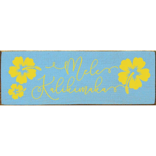 Perfect for your tropical den, the Mele Kalikimaka Hibiscus Wood Sign features a Hawaiian holiday greeting and hibiscus flowers in sunny yellow on light blue.
