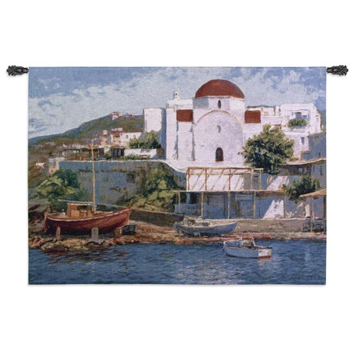 Create a coastal mood in your family room with the Mykonos II Wall Tapestry, enhanced with a peaceful Greek waterfront where boats drift ashore and rest on warm sand. Hanging rod not included.