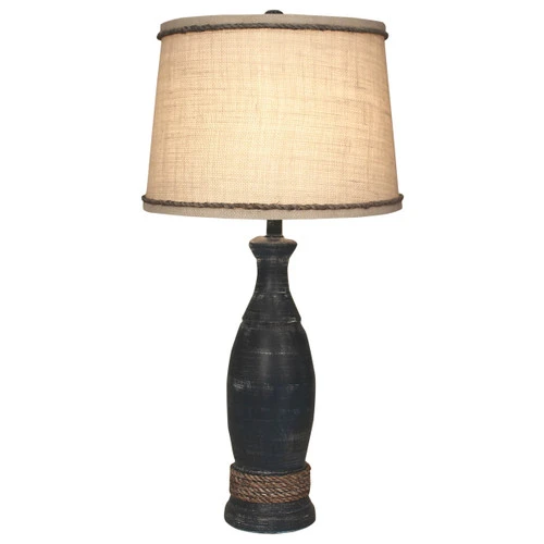 The Navy Table Lamp with Rope Accents adds nautical style to your den with a rustic, navy base with rope accents and a rope trimmed shade.