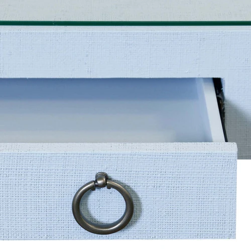 The Powder Blue Raffia Glass Top Desk with Silver Leaf Finish is a beautifully crafted desk that combines the soothing mist blue color and woven texture of raffia with a stunning silver leaf finish, creating an elegant and unique piece for your office or home workspace.