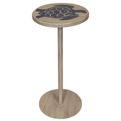 Give your living room beach flair with the Round Wood Turtle Drink Table, detailed with a blue-toned sea turtle on a weathered white wood top with a sturdy, matching metal base.