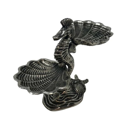 The Seahorse & Clam Shell Serving Dish in antique nickel is an elegant addition to any coastal-inspired table setting. The intricate seahorse design and clam shell dishes make it perfect for serving appetizers and snacks at your next gathering.