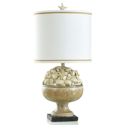 Create a beach atmosphere in your living room with the Seashell Bowl Table Lamp. This table lamp features a seashell motif and hand-applied coastal sand finish on the base topped with a sea star finial and a two tone burlap accented fabric shade for defining style.