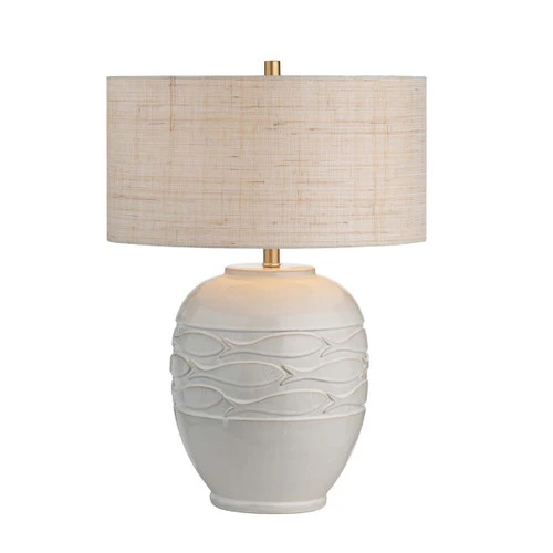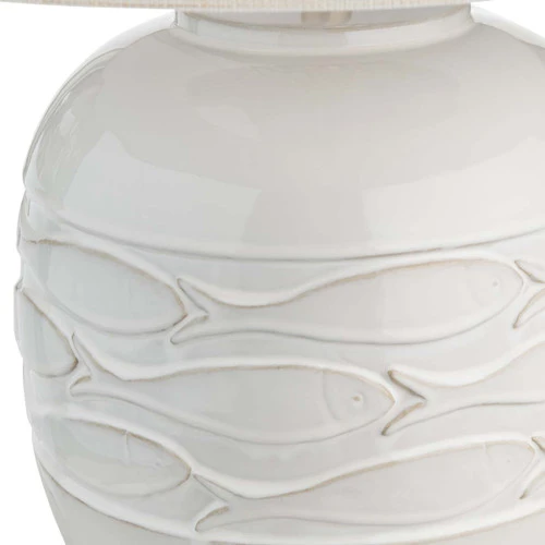 Bring coastal charm to your space with the Seaside School Table Lamp, featuring a shapely modern base adorned with a carved school of fish for a playful touch. Its glossy white ceramic finish and natural grasscloth shade harmonize beautifully, adding a coastal aesthetic to your home.