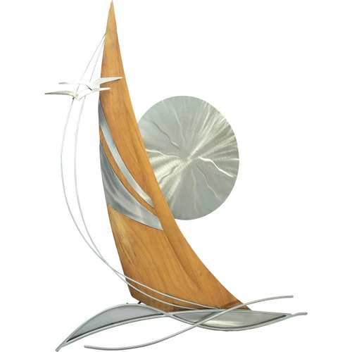 Give your living room a nautical update with the Sunset Sail Wall Décor. Crafted with a graceful teak and stainless steel sailing scene, this wall décor makes a beautiful accent.