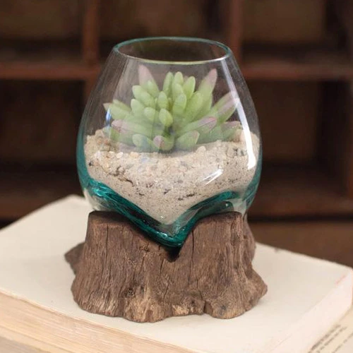 Create a coastal atmosphere in your living room with the Teakwood Glass Planter – Small. This terrarium features a handmade and versatile design for defining style.