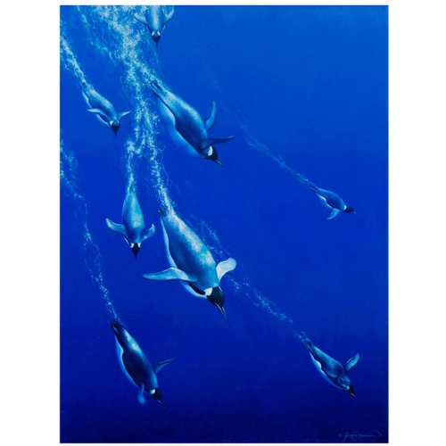 The Blue Angels Limited Edition Print adds coastal style to your entryway with a group of detailed, diving penguins.