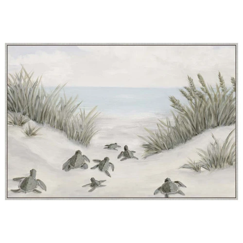 Add a touch of aquatic charm to your space with the Turtle Trek Framed Wall Art. This beautifully embellished canvas print features a serene beach side scene that will enhance any room’s decor.