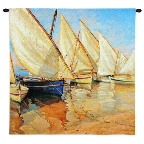 Create a nautical mood in your library with the White Sails I Small Wall Tapestry, enhanced with colorful sailboats with billowing white sails lined up along the shore. Hanging rod not included with this sailboat wall art.